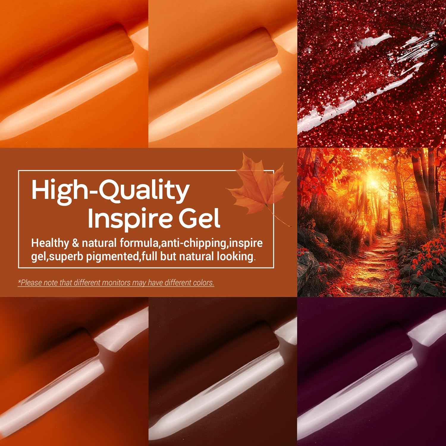 - Fall Gel Nail Polish Kit: 6 trendsetting fall winter colors - Pumpkin Orange, Carrot Orange, Glitter Red, Color Changing Orange, Maroon Brown, Dark Purple. Is the time of colorful foliage, crisp air, the first frost, and pumpkin spice