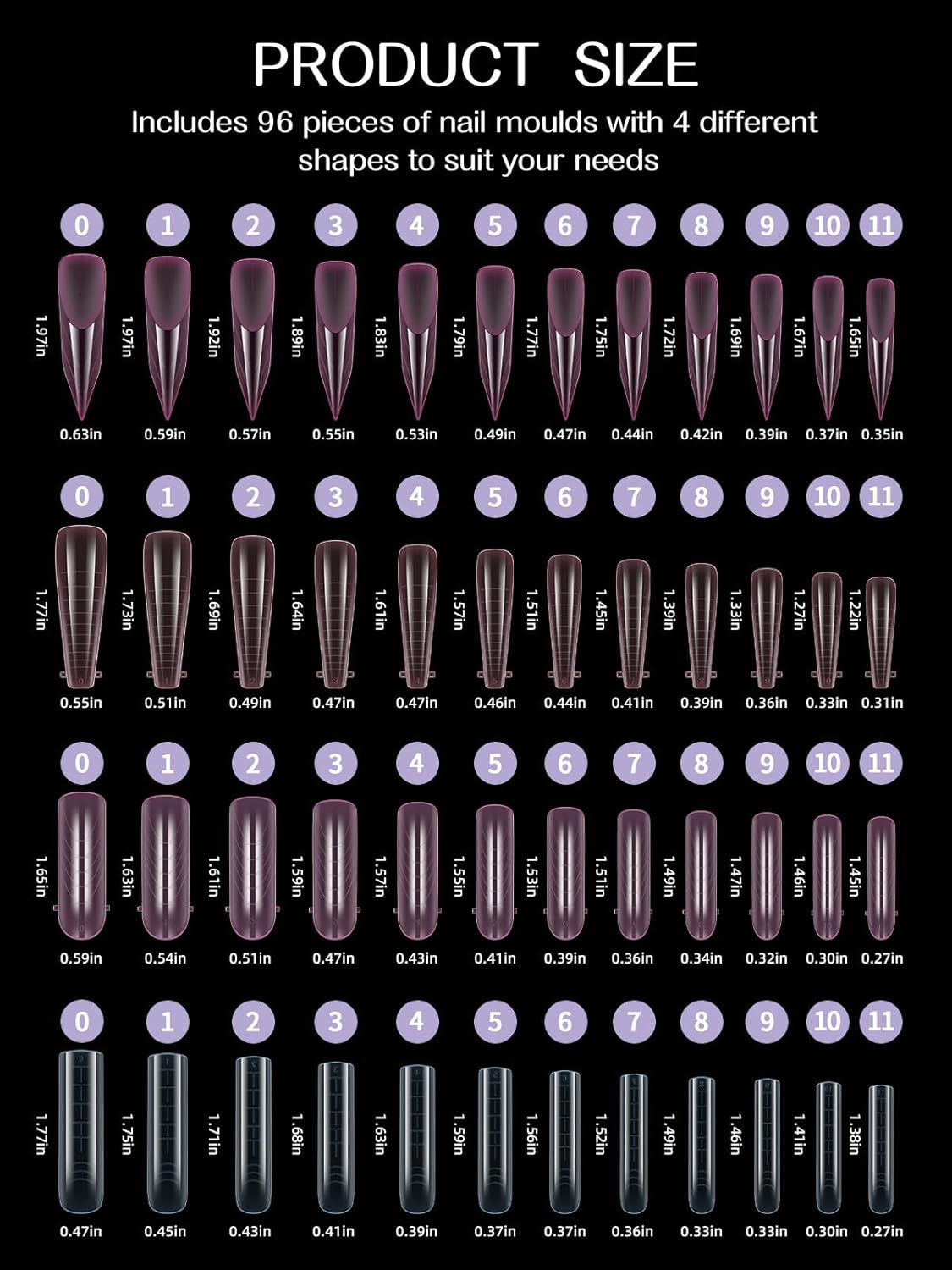 - 【12 Sizes of Nail Form Mold】96PCS coffin clear dual forms for poly nail gel offers 12 different nail sizes , and each size of long nail tips is separated by a small grid, a total of 12 grids, so they're easy and convenient to choose the suitable size to meet your nail's need.