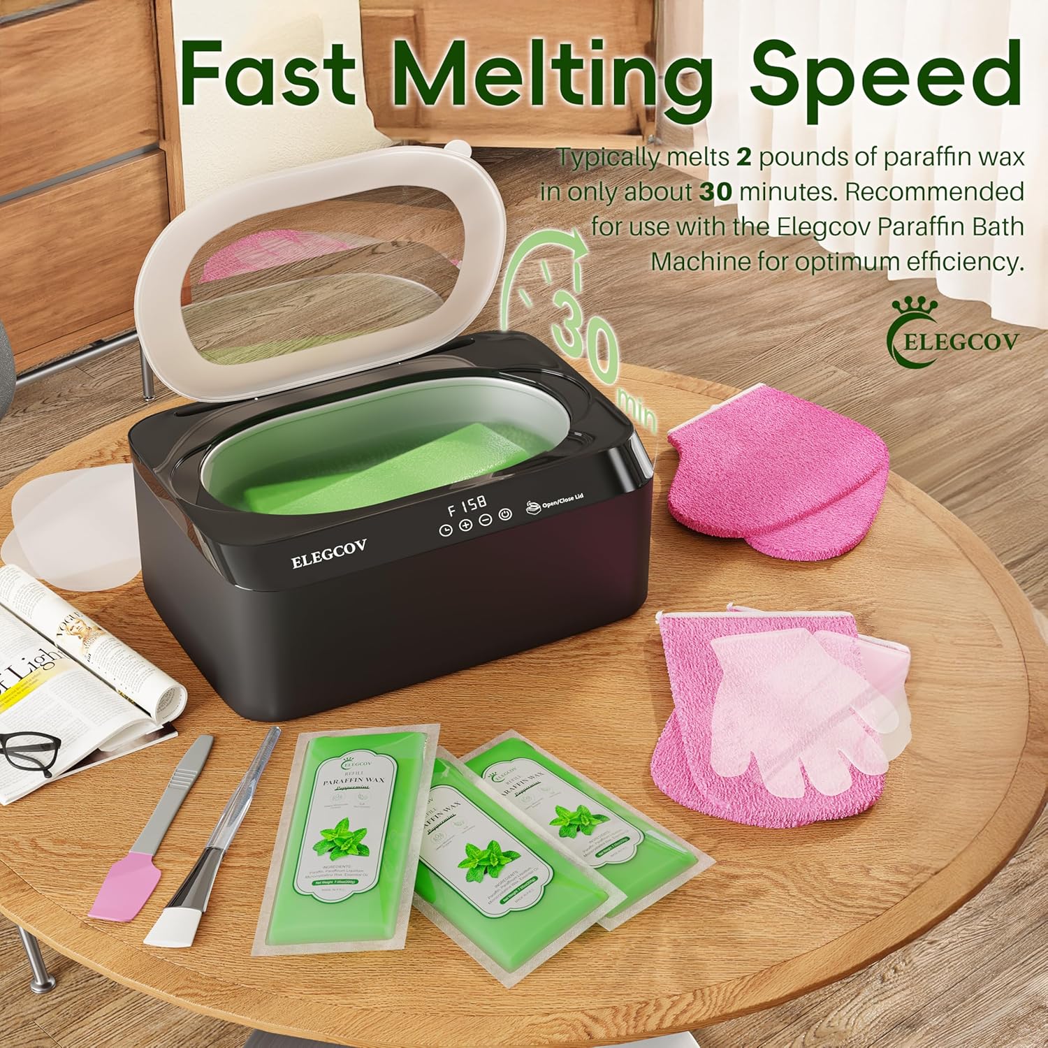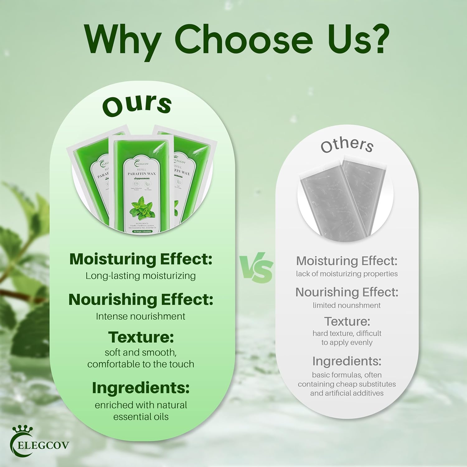 - Easy to Use with Any Paraffin Bath: These peppermint paraffin wax refills are seamlessly compatible with most paraffin wax baths, especially when paired with the use of our Elegcov's paraffin wax machine, which melts evenly and quickly, ensuring a spa-like experience at home