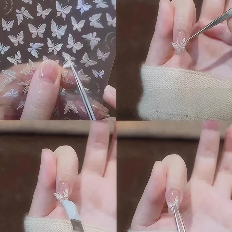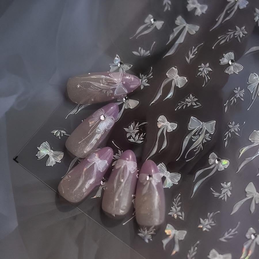 4 Sheets White Nail Art Stickers Decals Bow-tie Butterfly Nail Stickers 3D Self Adhesive with Pearls Nail Decals Supplies Nail Art Design Decoration Accessories for Women and Girls