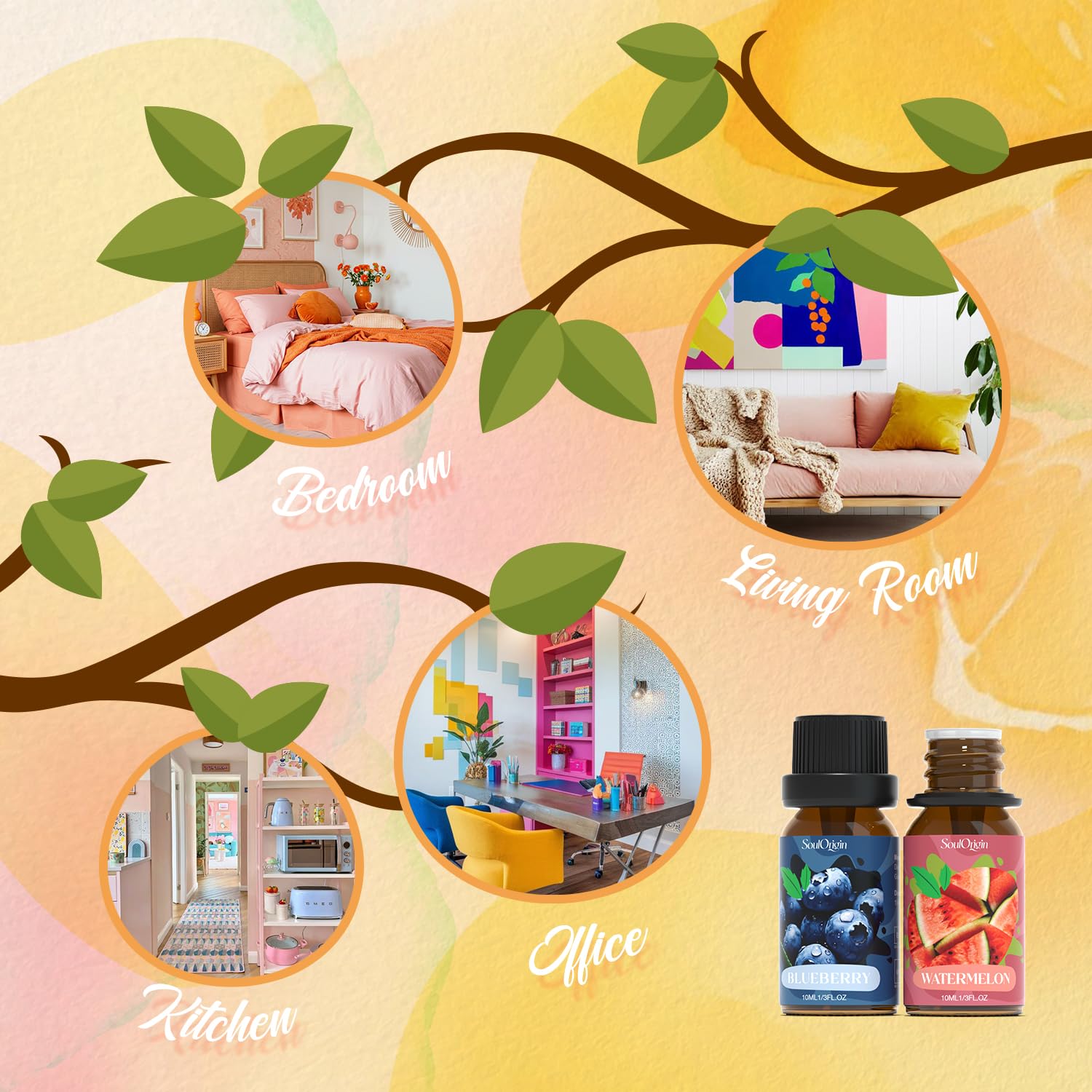 - Brighten Your Space: Add a splash of sunshine to your day with fruit essential oil blends that fill your home with cheerful, uplifting aromas. Perfect for creating a joyful, energizing environment—these fruity scents are ideal for kitchens, living rooms, bathrooms, and anywhere you want to feel refreshed.