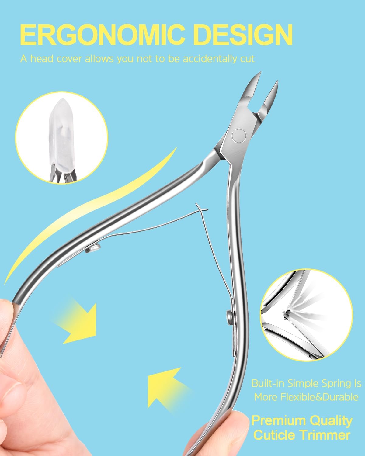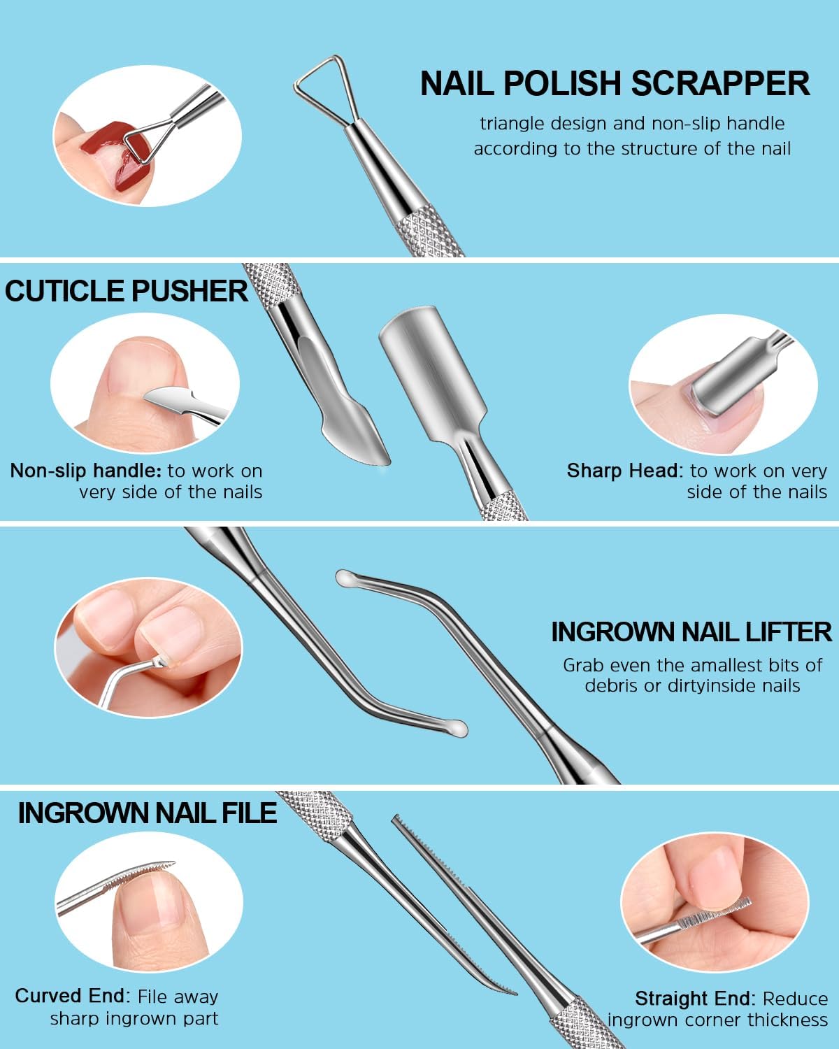 - Cuticle Trimmer Set: the stainless steel cuticle clippers for nails are sharper and more efficient for a long time, making sure that the cuticle are easily removed. Other 4 pcs manicure tools help you reach nail edge more easily to remove the stubborn debris effortlessly
