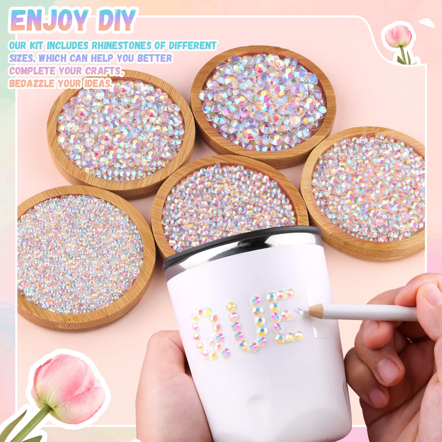 - PACKAGE CONTENT – This all-in-one bedazzler kit includes everything you need to start creating dazzling designs: 1 box of Transparent AB rhinestones with 24 grids (approx. 30,000 pcs of bedazzling rhinestones assorted size SS6/10/16/20/30 ), 1 precision tweezers, 1 pickup pen for handling small gems, and 3 tubes of B7000 jewelry glue for secure application.