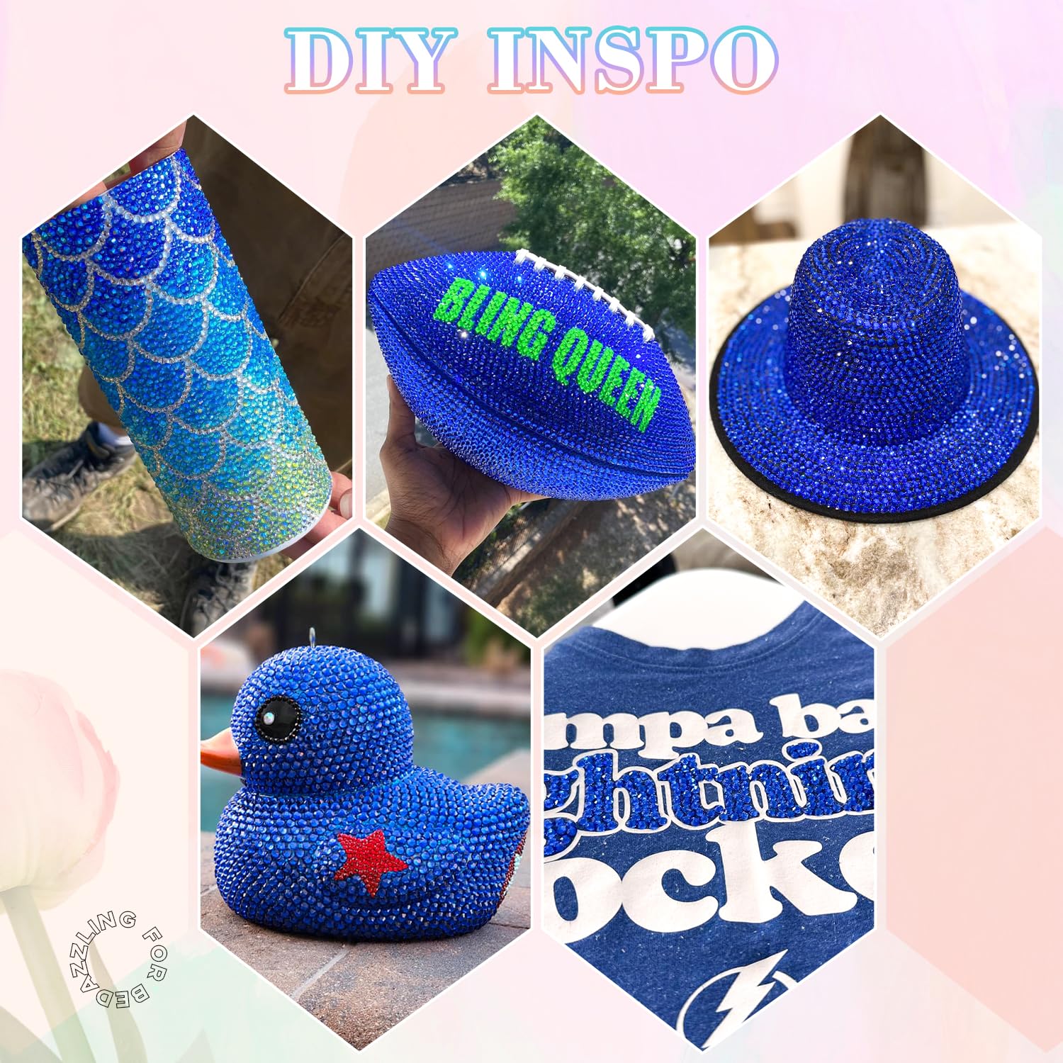 - PACKAGE CONTENT – This all-in-one bedazzler kit includes everything you need to start creating dazzling designs: 1 box of Royal Blue rhinestones with 24 grids (approx. 30,000 pcs of bedazzling rhinestones assorted size SS6/10/16/20/30 ), 1 precision tweezers, 1 pickup pen for handling small gems, and 3 tubes of B7000 jewelry glue for secure application.