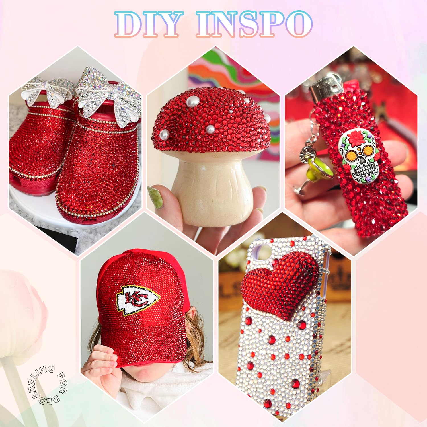 - PACKAGE CONTENT – This all-in-one bedazzler kit includes everything you need to start creating dazzling designs: 1 box of Red rhinestones with 24 grids (approx. 30,000 pcs of bedazzling rhinestones assorted size SS6/10/16/20/30 ), 1 precision tweezers, 1 pickup pen for handling small gems, and 3 tubes of B7000 jewelry glue for secure application.
