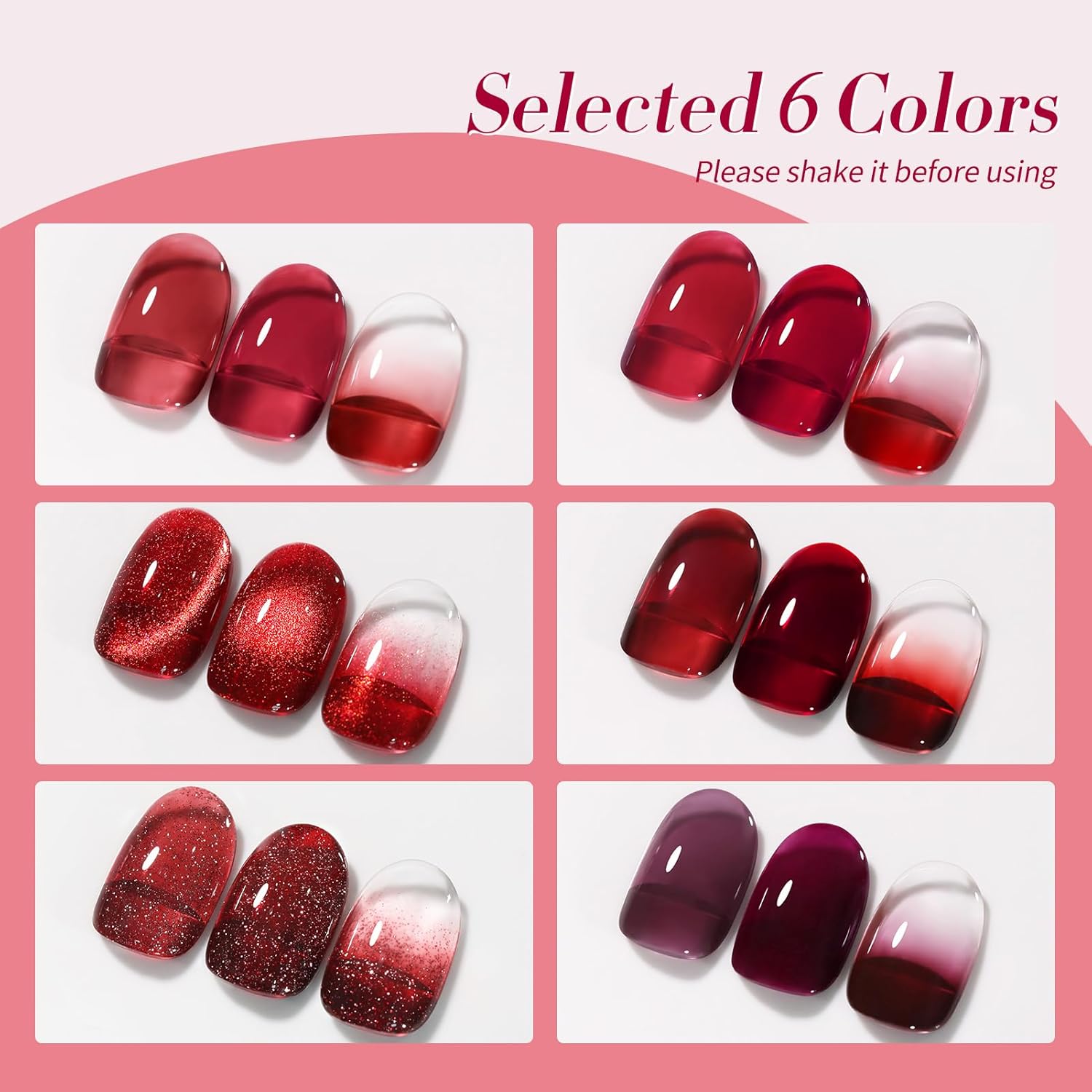 - PACKAGE CONTENTS:6 Bottles BORN PRETTY 7ml jelly Ruby Red Glitter Cat Magnetic Eye Gel Nail Polish Fall Winter Blood Cherry Wine Red Gel Polish set. The newly upgraded formula can suck out the perfect cat-eye shapes in a few seconds. Cure under U v/LED nail dryer lamp, making it suitable for natural, false, and acrylic nails. Say goodbye to expensive trips to the salon and hello to DIY fun and professional-looking results!