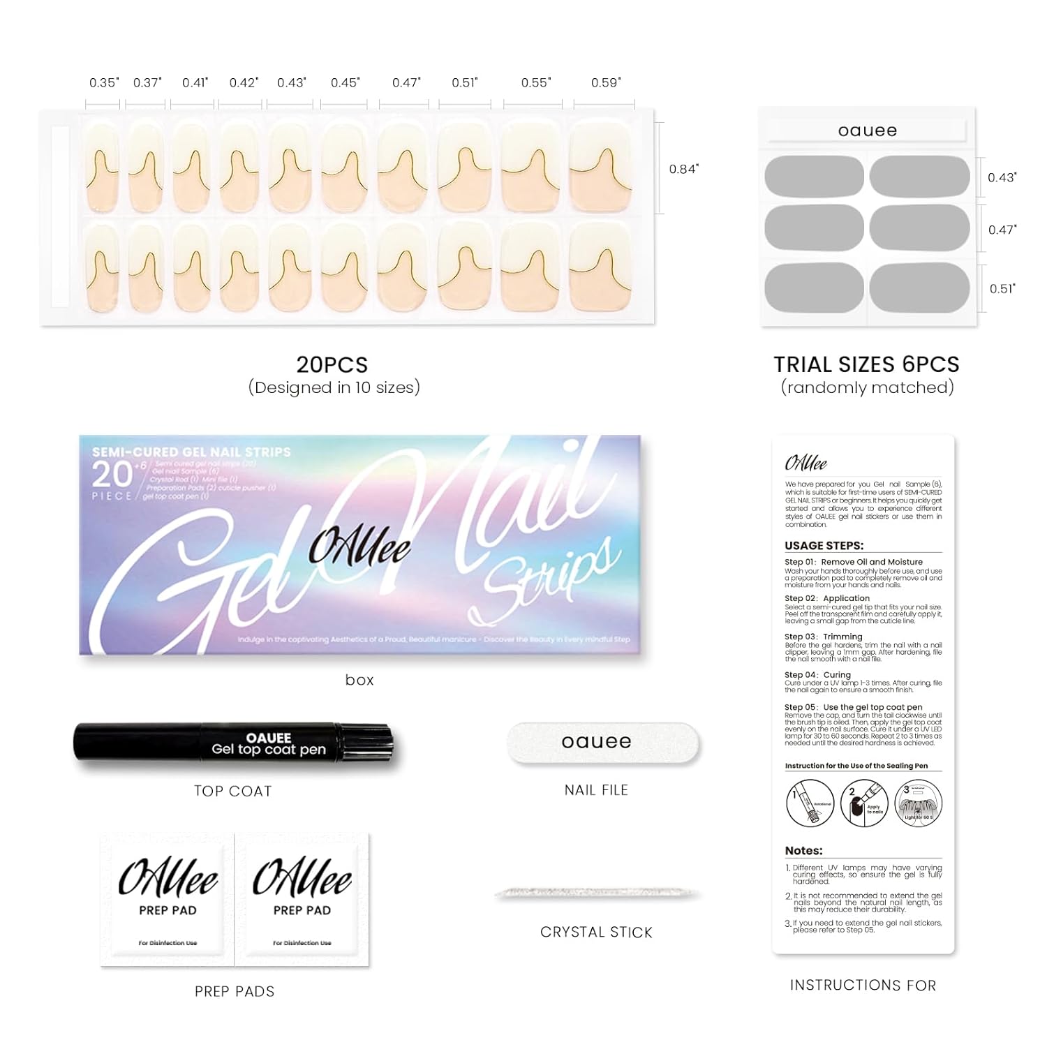 - Product Upgrade: OAUEE has developed an upgrade plan to make the edges of the gel nail stickers more snug, allowing even beginners to better use our gel nail stickers. To achieve a salon-level manicure effect, we have added tempered gel topcoat, enabling professional manicure enthusiasts to better customize their nail shapes