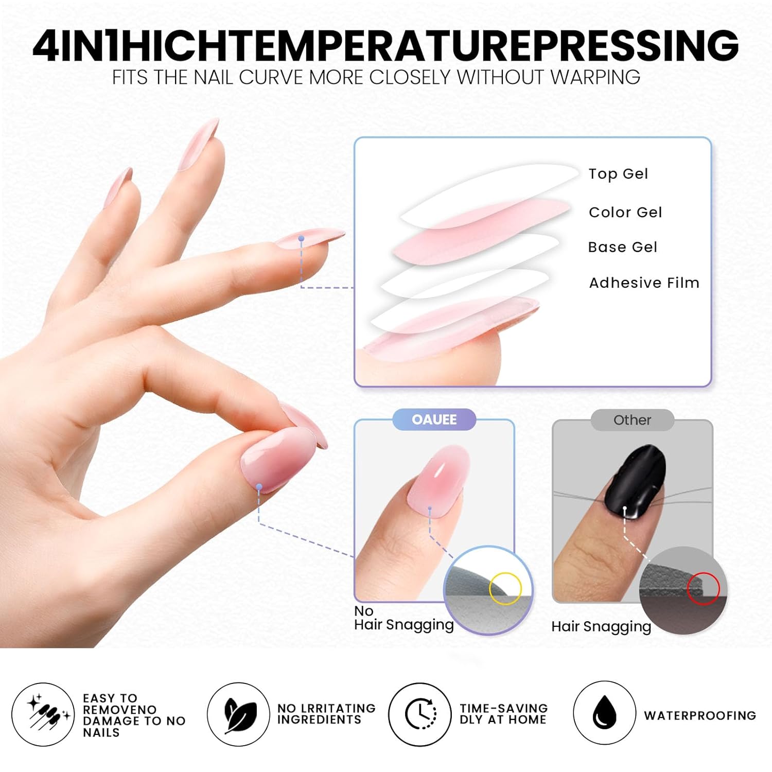 - Product Upgrade: OAUEE has developed an upgrade plan to make the edges of the gel nail stickers more snug, allowing even beginners to better use our gel nail stickers. To achieve a salon-level manicure effect, we have added tempered gel topcoat, enabling professional manicure enthusiasts to better customize their nail shapes