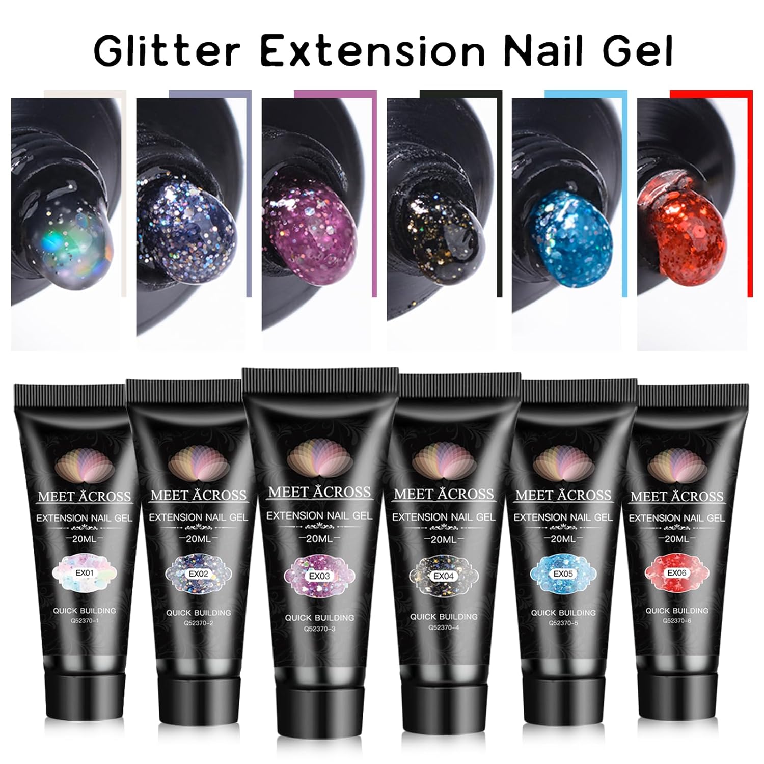 MEET ACROSS 20ML Poly Nail Gel Set - 6 Colors Glitter Sequins Extension Nails, Blue Black Red Purple Long Lasting, Shiny-looking, Strong Builder Enhancement for Salon Manicure DIY at Home
