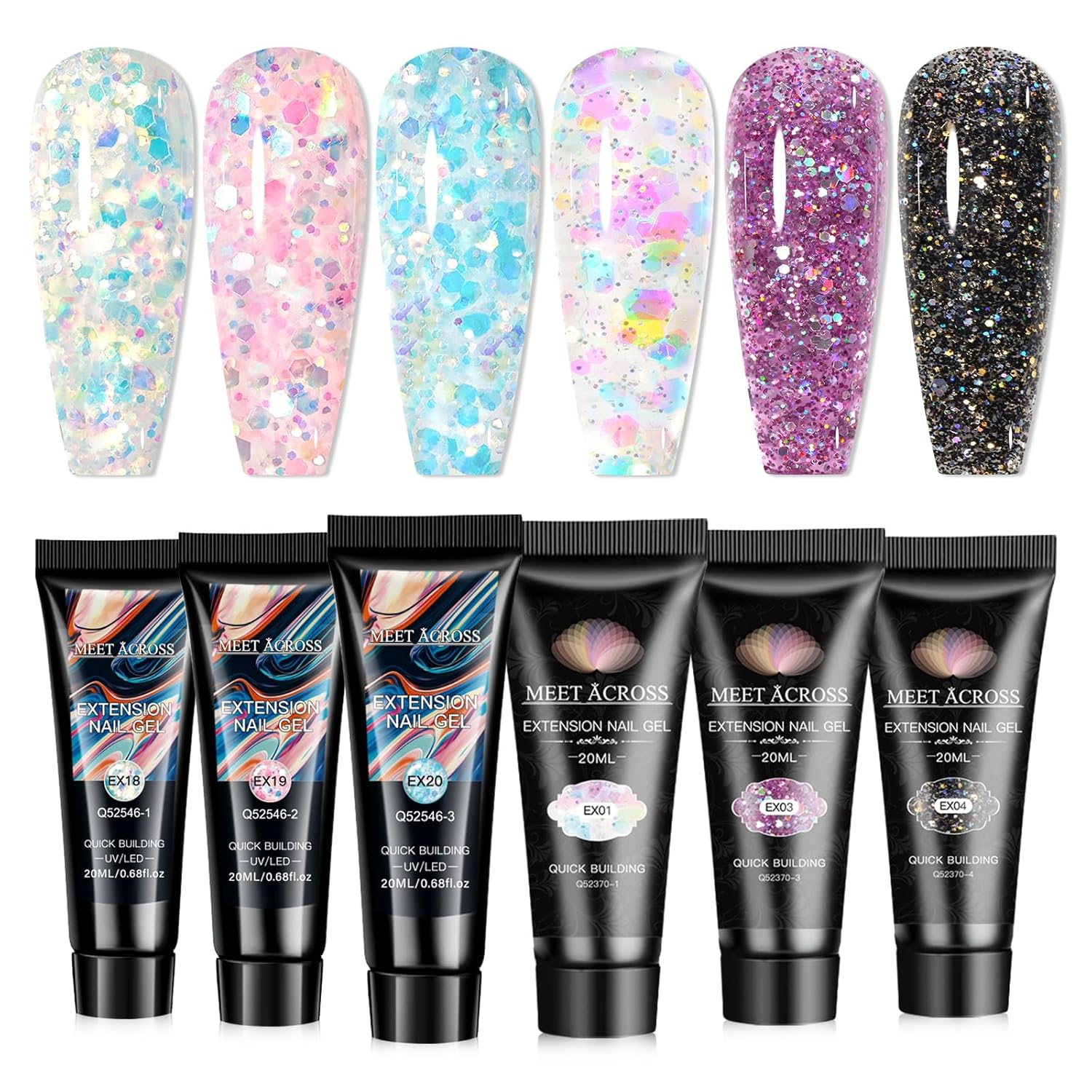 MEET ACROSS Poly Nail Gel Kit - 6 Colors Long-Lasting Glitter Poly Extension Gel, Shiny Sequins Builder Extension Nail Gel Set, Soak Off UV LED Nail Art at Home Salon