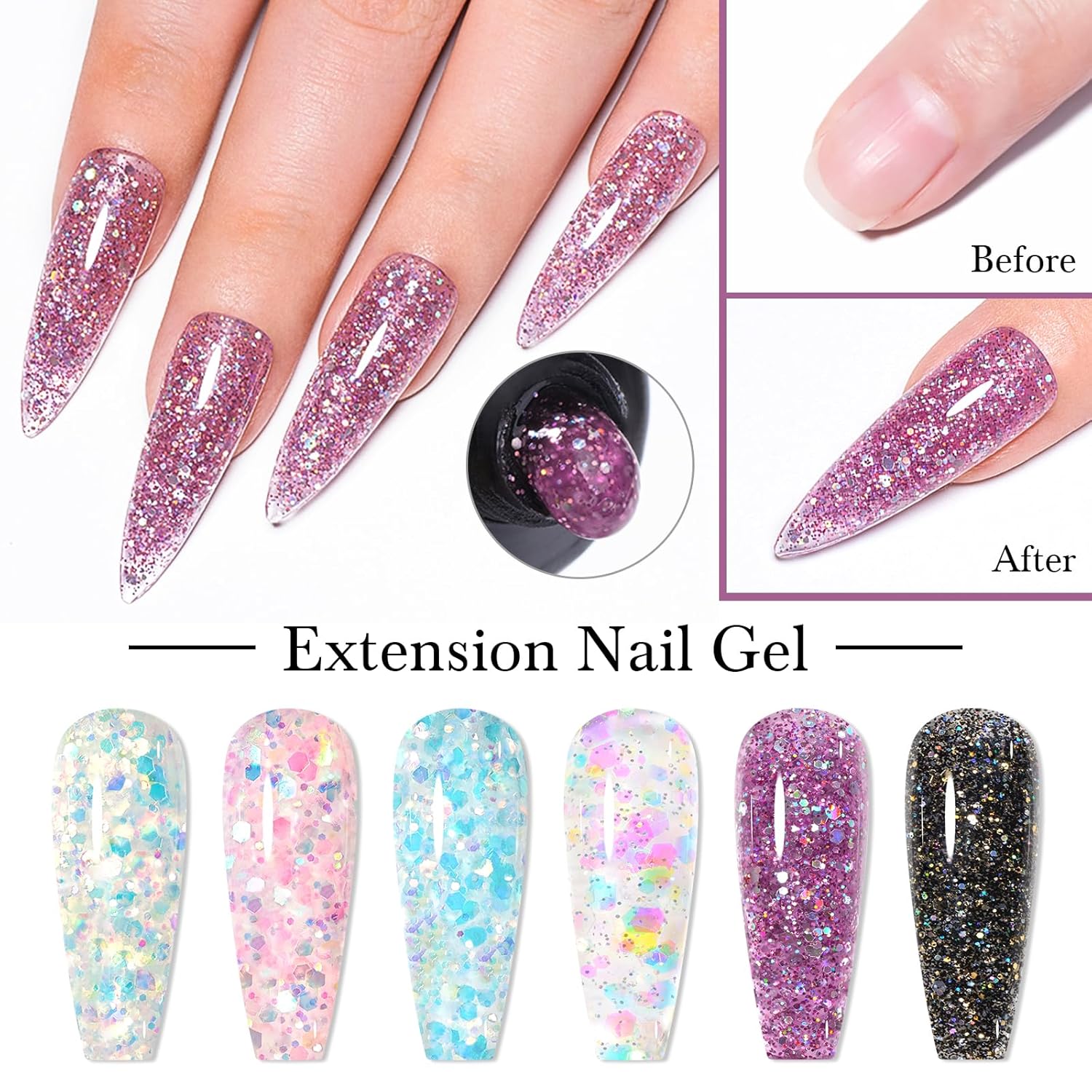- All Season Extension Gel Nail: This glitter sequins gel builder kit for gel nail extension comes with 6 colors glitter shades, perfect for all seasons and daily colors. Our poly nail gel kit can be shaped to overlay, extend, strengthen and repair your nails, make them shiny and good-looking.