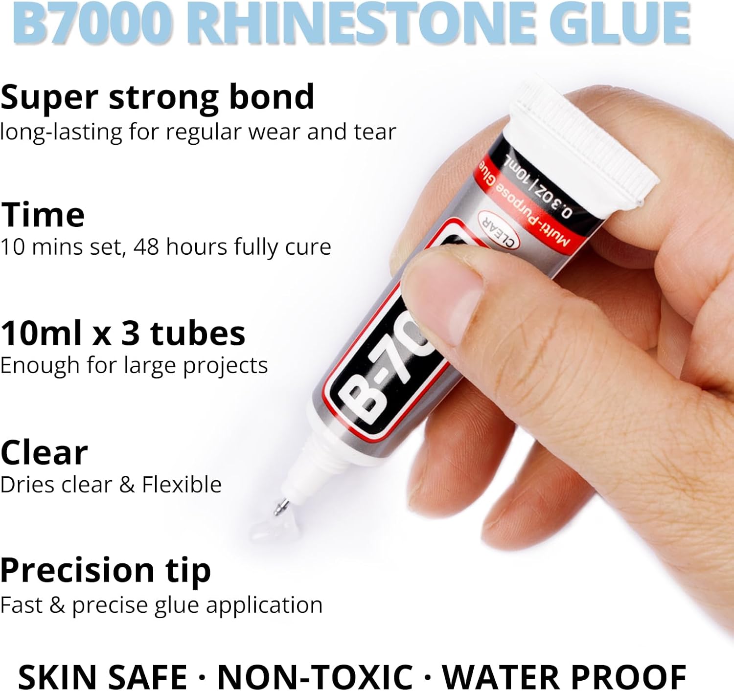 - B7000 Clear Glue for Gemstones -- B7000 glue has strong adhesion and dries clear, waterproof when dried, non-toxic and harmless to the skin. The glue has a precision needle for easy application, they can be applied precisely