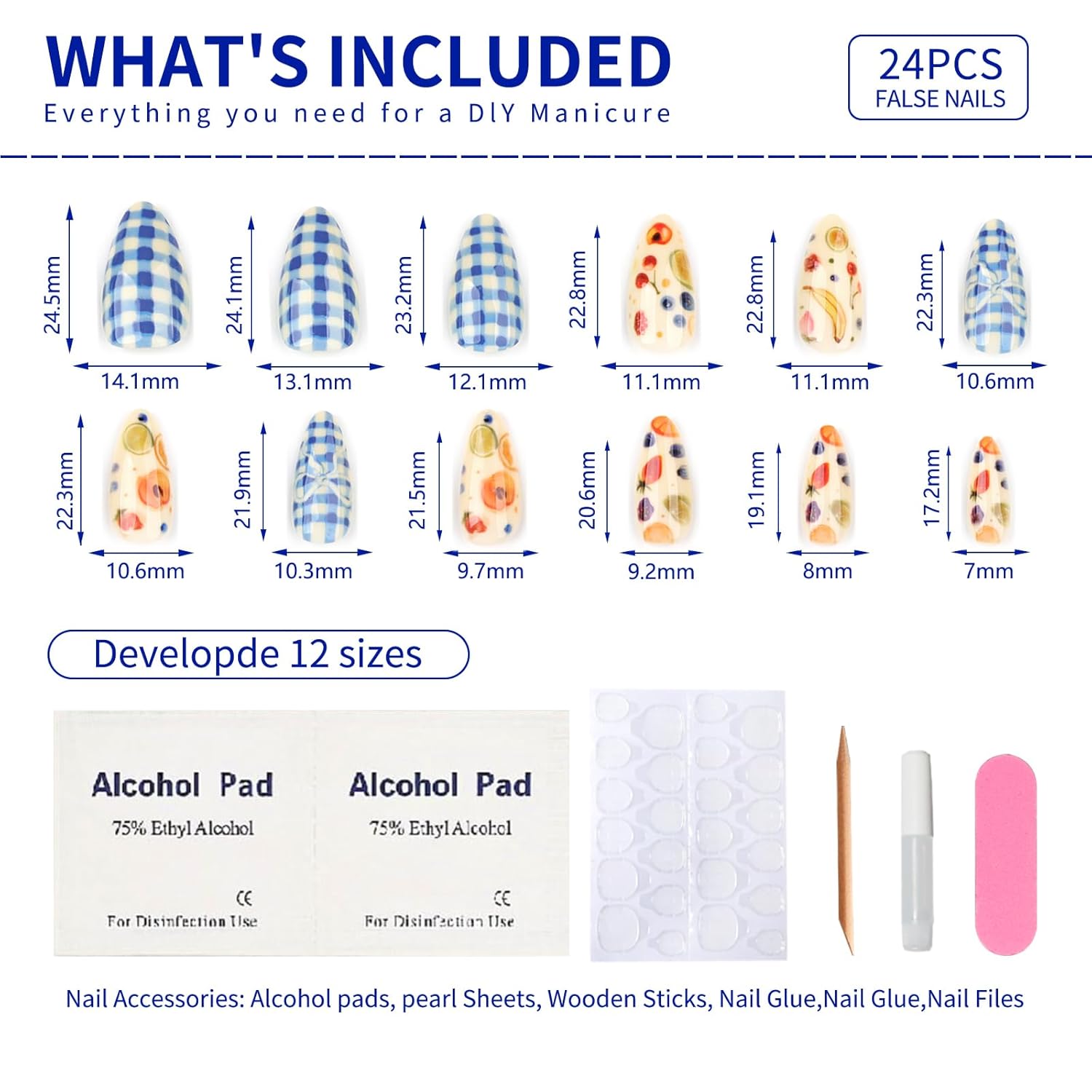 Summer Fall Picnic Press On Nails Short – Almond Cute Fake Nails with Fruit and Blue Gingham Design, Colorful Summer Nails Press Ons, Glossy Glue On Nails Kit for Women, Fruit Part, 24Pcs