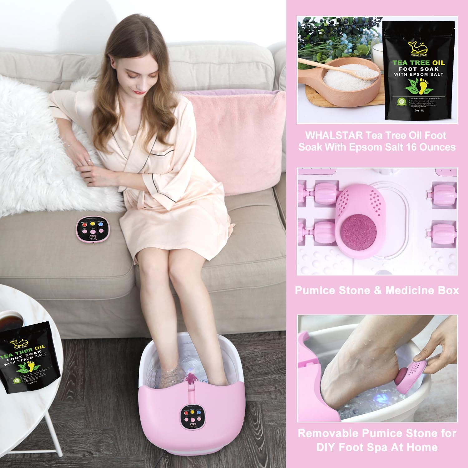 Foot Spa Bath Massager with Heat Bubbles and Vibration Massage and Jets, 16oz Tea Tree Oil Foot Soak Epsom Salt, WHALSTAR Collapsible Foot Bath Bucket With Infrared Fighting Infections & Remote - PINK