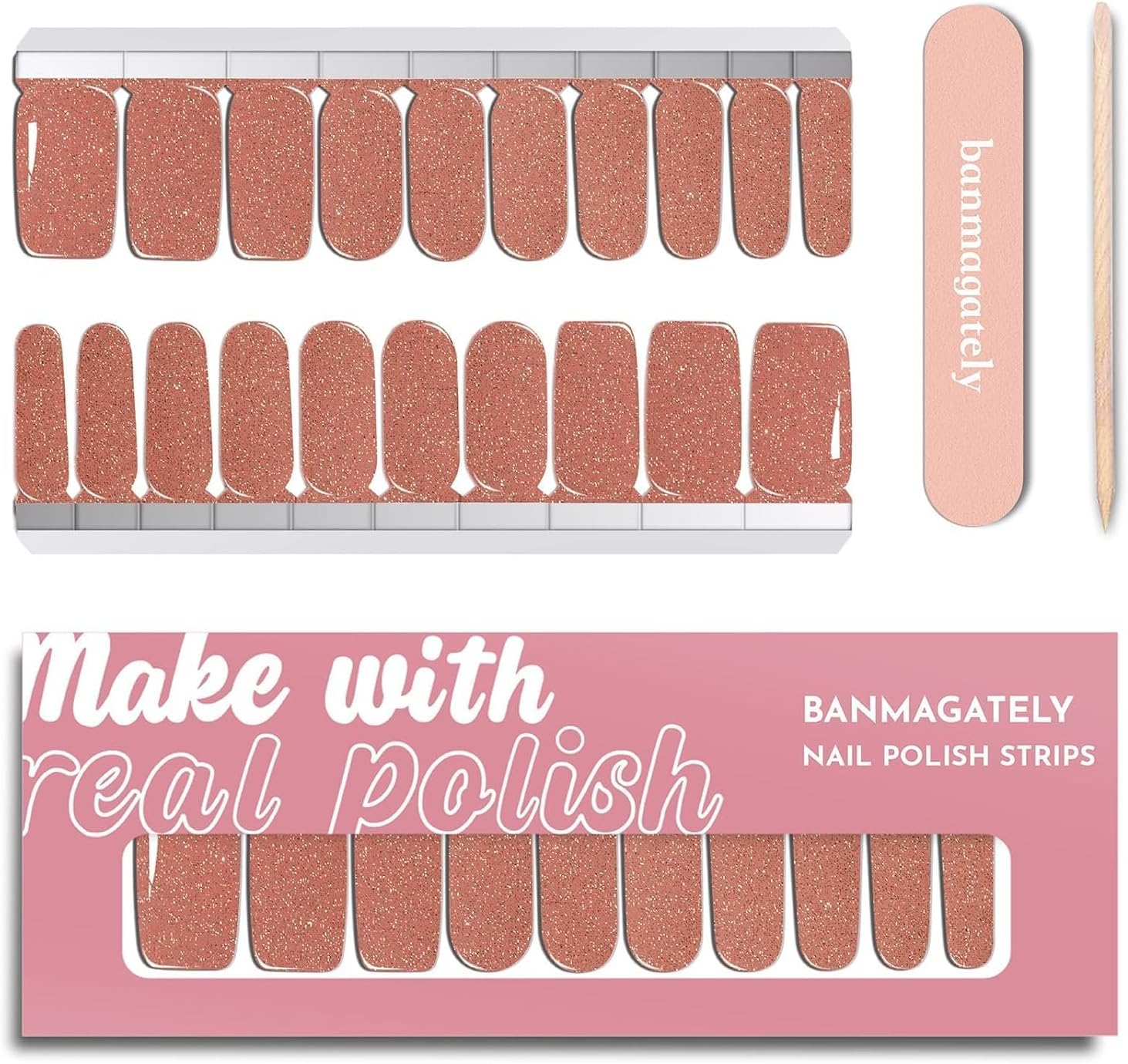 Nail Polish Strips, 20Pcs Salon Quality Gel Nail Stickers, Easy Long Lasting Wraps for Short Nails no UV Light Needed (Glitter Cinnamon)