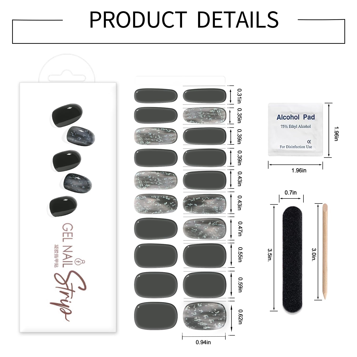 - BLACK GLITTER DESIGN SEMI CURED GEL NAIL STRIPS - Each stylish box includes 1 sheet with 10 sizes, totaling 20 strips in a unique blend of Black Glitter hues, embodying Dark Glamour. Additionally, it provides adaptability with 2 strips per size, catering to various nail lengths.