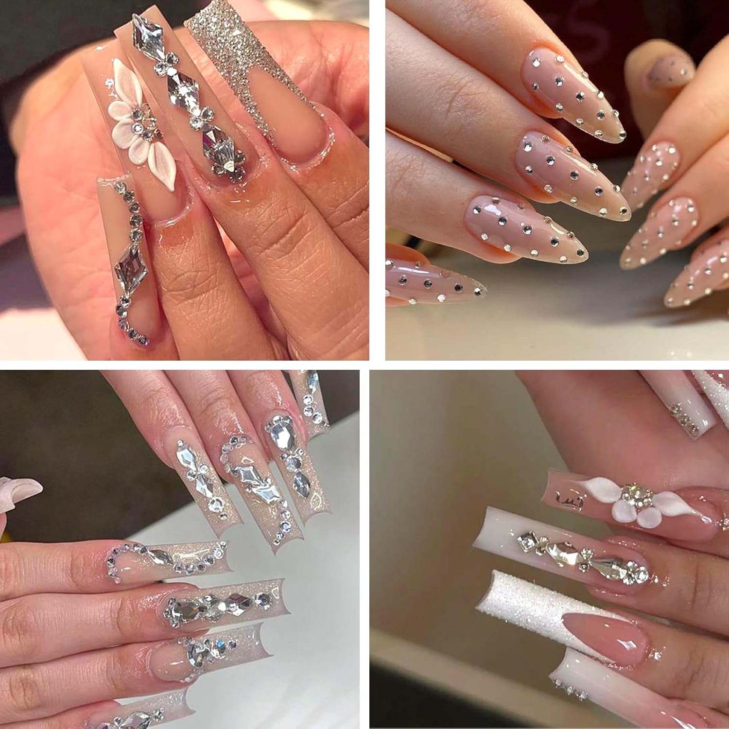 Nail Rhinestones - 3D Multi Shape Size, Flat Back, Manicure Rhinestones Charms, Crystals White Gems, with Kit, for Nail Art, Bedazzling Acrylic Nails, DIY Decor