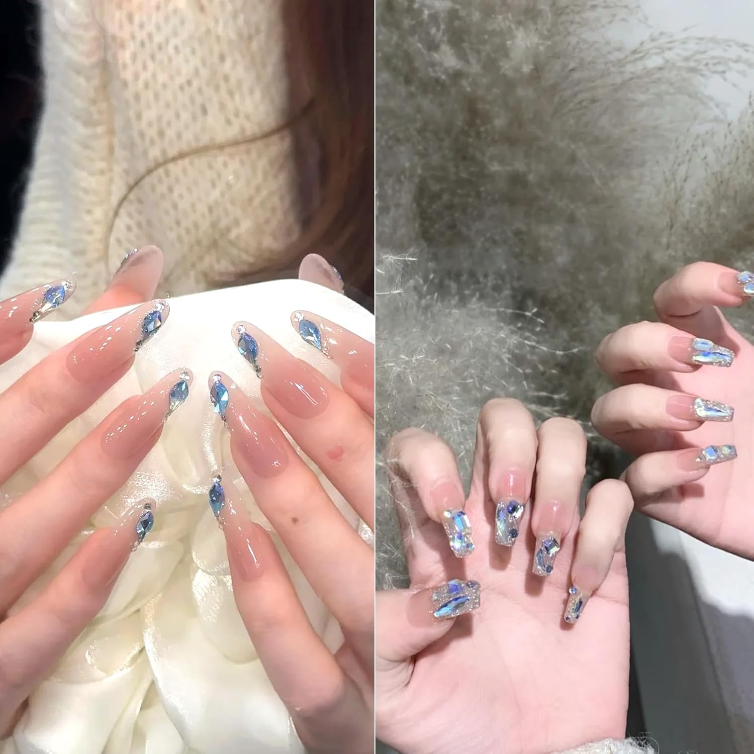 Nail Rhinestones - 3D Multi Shape Size, Flat Back, Manicure Rhinestones Charms, Crystal Moonlight Blue Gems, with Kit, for Nail Art, Bedazzling Acrylic Nails, DIY Decor