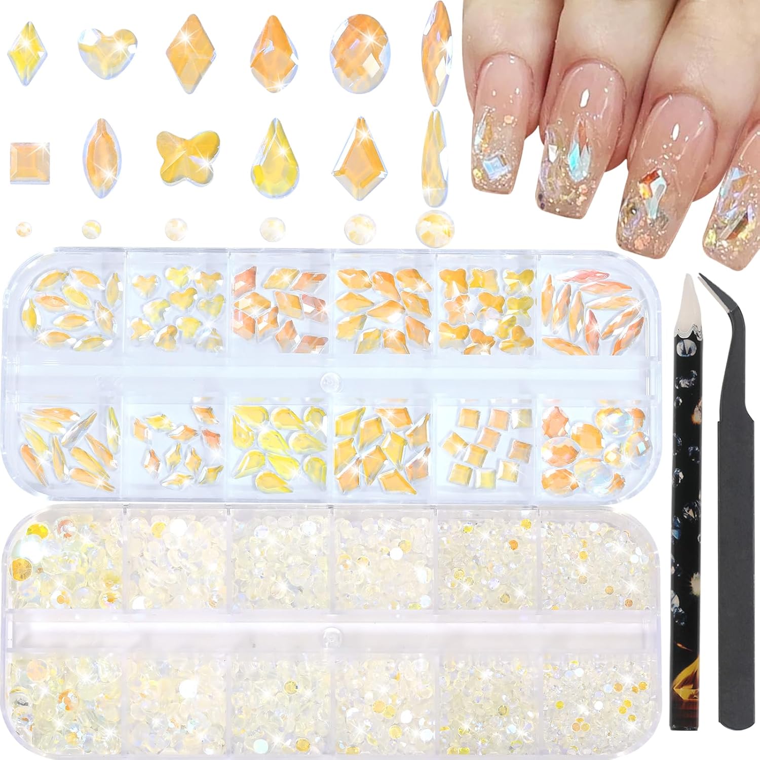 - ★Aurora nail rhinestones and Charms set- contains 2 boxes nail art rhinestones, flat back nail rhinestones, Multi-shape nail gem rhinestones, 1pcs tweezer for large size gems, 1pcs pickup pen for small size gems and 6 sizes round nail art rhinestones are 1.8mm, 2mm, 2.5mm, 2.8mm, 3mm, 4mm, different sizes of mixed crystal rhinestones can match different nail art styles,will bedazzle your acrylic nails!