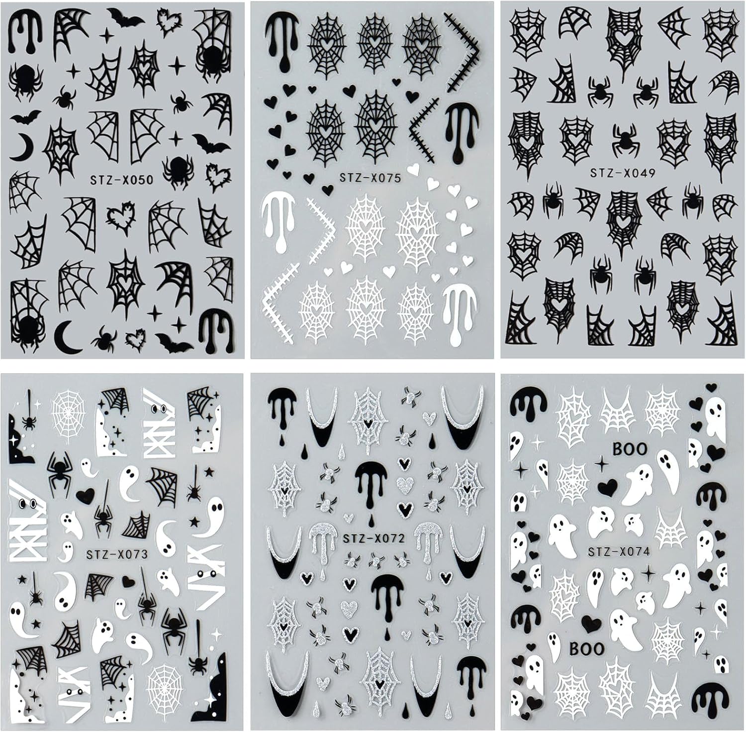 6 Sheets Halloween Nail Art Stickers Cute Ghost Nail Decals Black White Spider Web Bat Stars Moon Design Gothic Nail Art Supplies for Holiday Acrylic DIY Nail Decoration