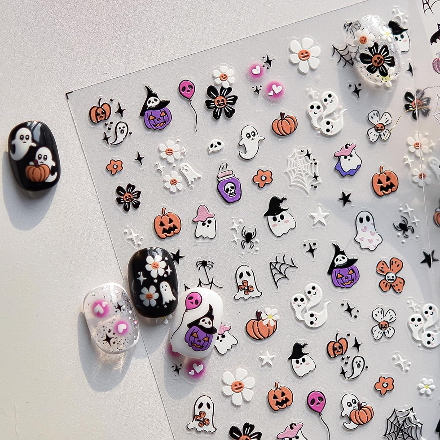 - Quantity:You will get 1 Sheet Halloween nail art stickers decals for nail art, halloween cute ghost pumpkin flower nail stickers, 3D self adhesive nail design which can offer you multiple choices, meet your Halloween nail decoration needs