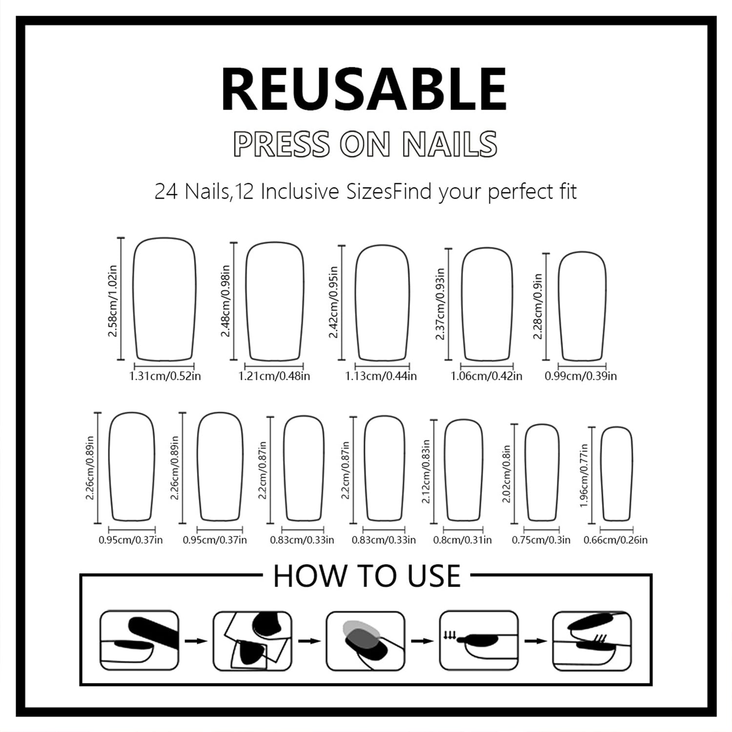- Package: You'll get 24 Thanksgiving glitter fake nails in 12 sizes. 1 mini nail file, 1 small wooden stick, 1 piece of adhesive tab glue. You can safely choose a fake nail that fits your finger size and DIY your desired nail shape