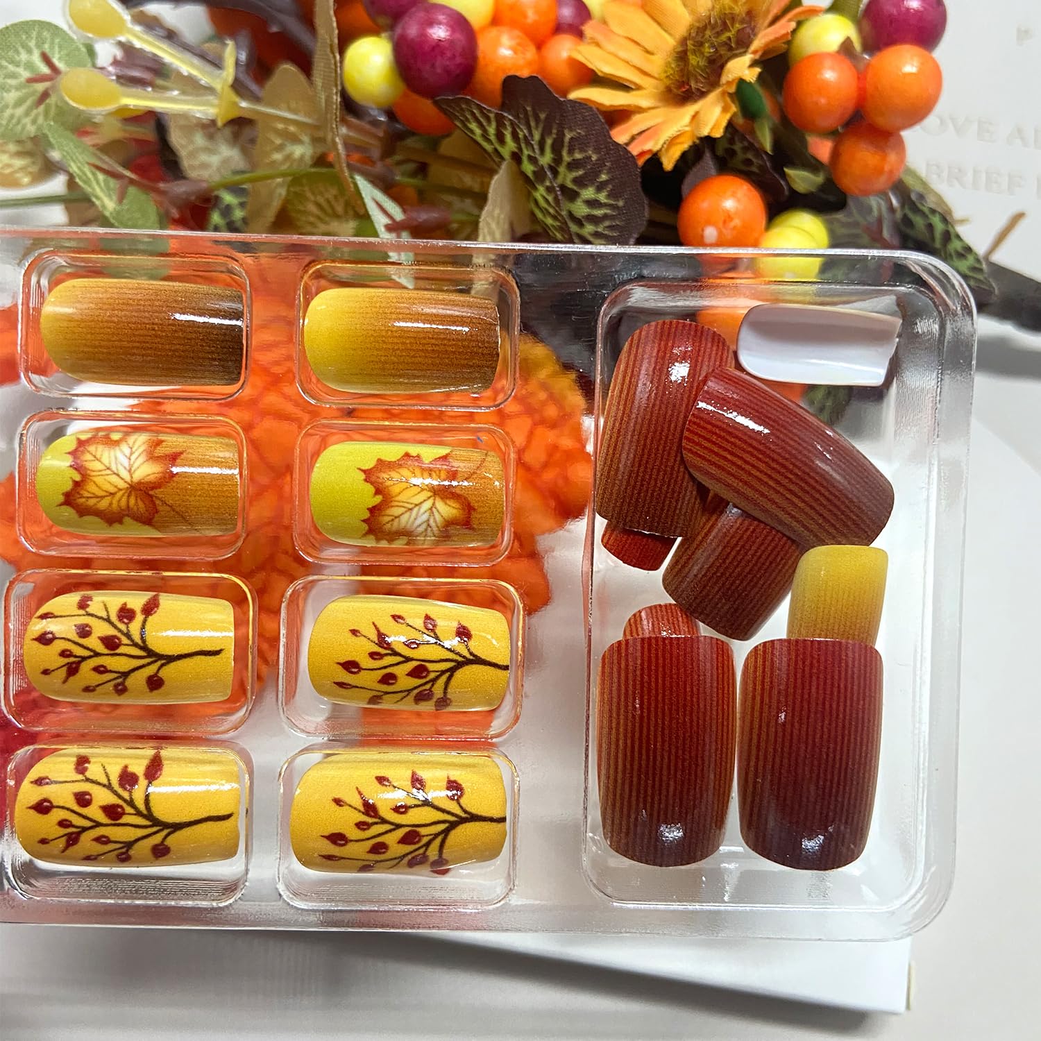 - Package: You'll get 24 Thanksgiving fake nails in 12 sizes. 1 mini nail file, 1 small wooden stick, 1 piece of adhesive tab glue. You can safely choose a fake nail that fits your finger size and DIY your desired nail shape