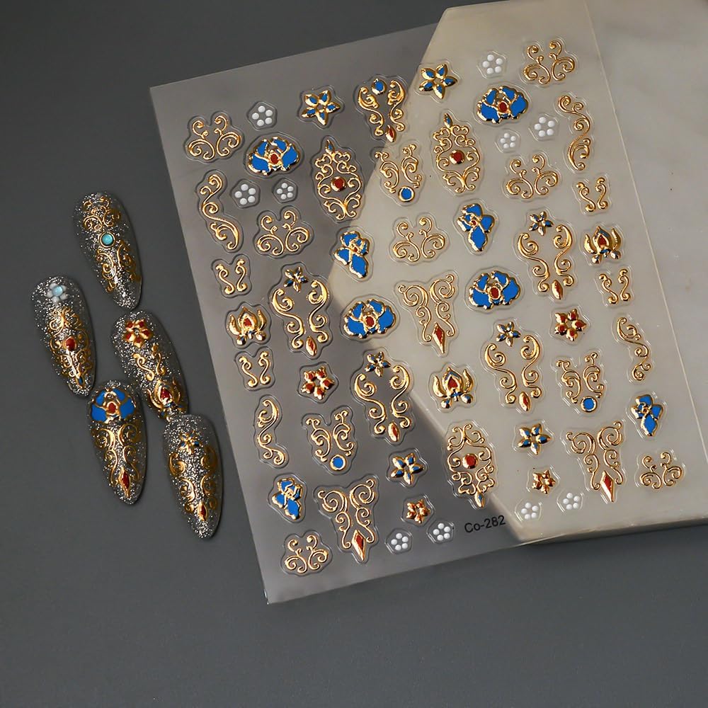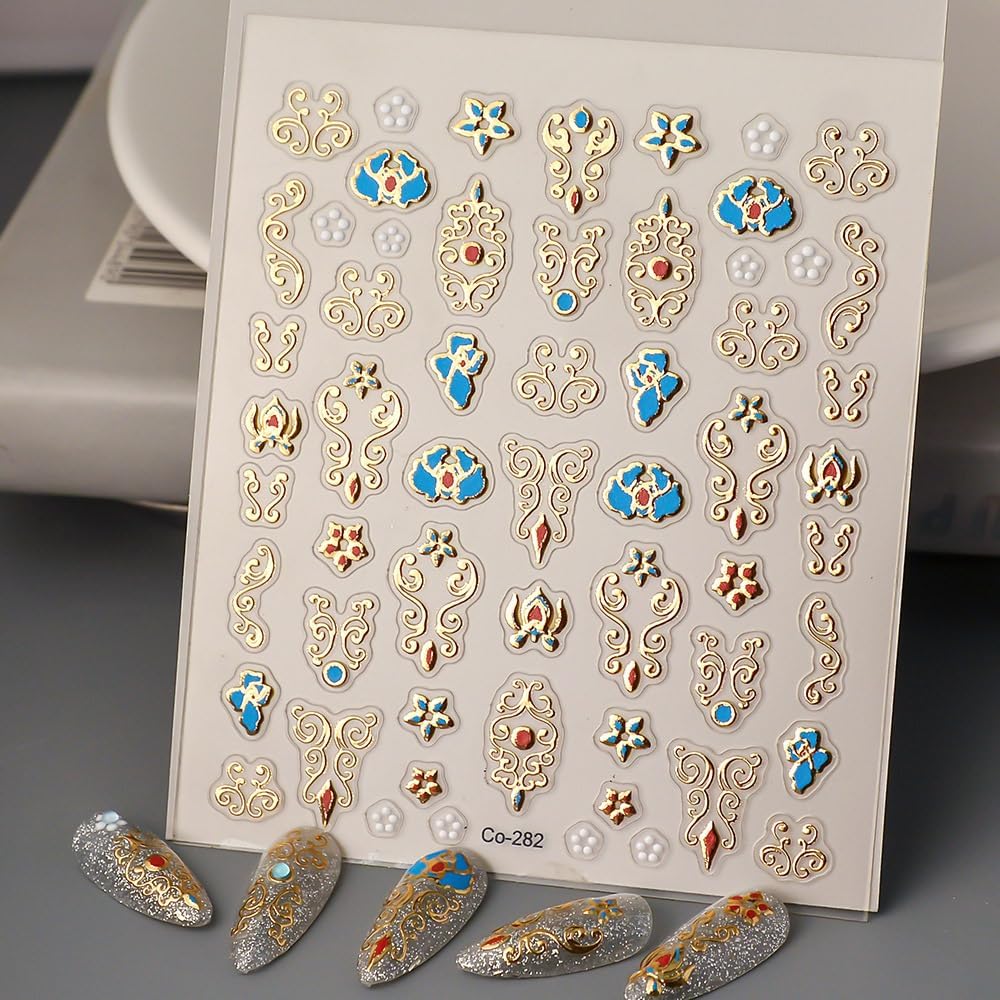 Gold Fall Nail Art Stickers 5D Embossed Geometric Bohemian Nail Stickers, Self-Adhesive Durable Nail Art Decals for Women Girls, Nail Wraps Decoration Manicure for DIY Acrylic Nail Accessories