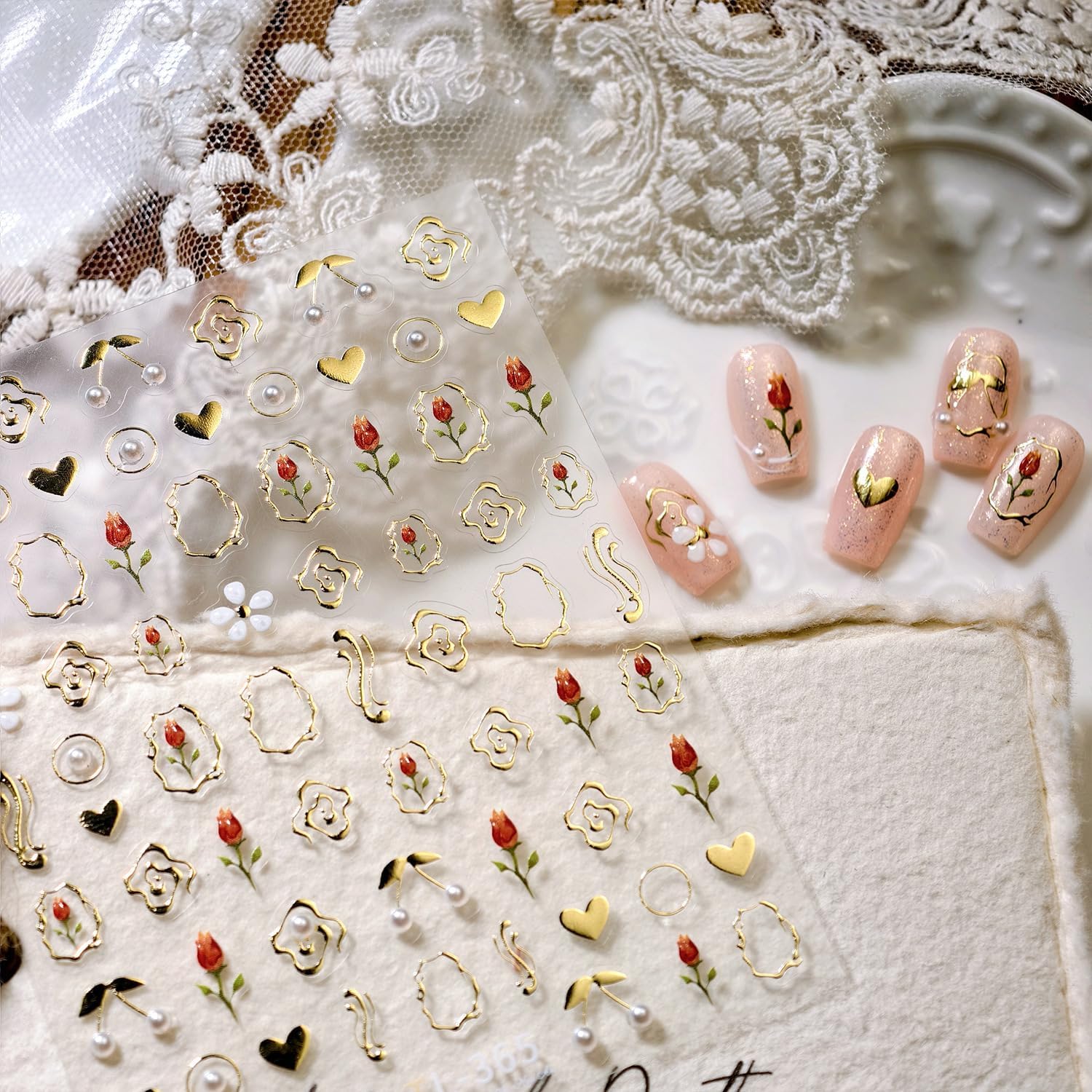 Tulip Nail Art Stickers 5D Embossed Flower Pearl Cherry Nail Stickers, Self-Adhesive Durable Nail Art Decals for Women Girls, Nail Wraps Decoration Manicure for DIY Acrylic Nail Accessories