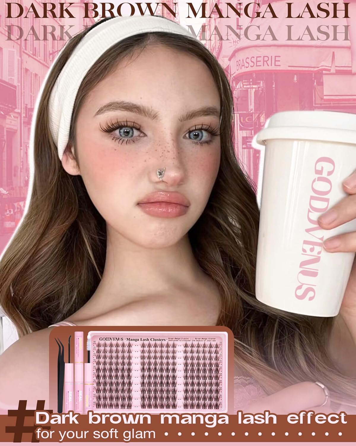 - DIY Lash Cluster Kit for Natural Brown Manga Look: Dark brown lash fibers create soft, defined eyes without the harshness of black cluster lashes β cute for achieving the trending "manga eye" aesthetic with a subtle, everyday glam finish.