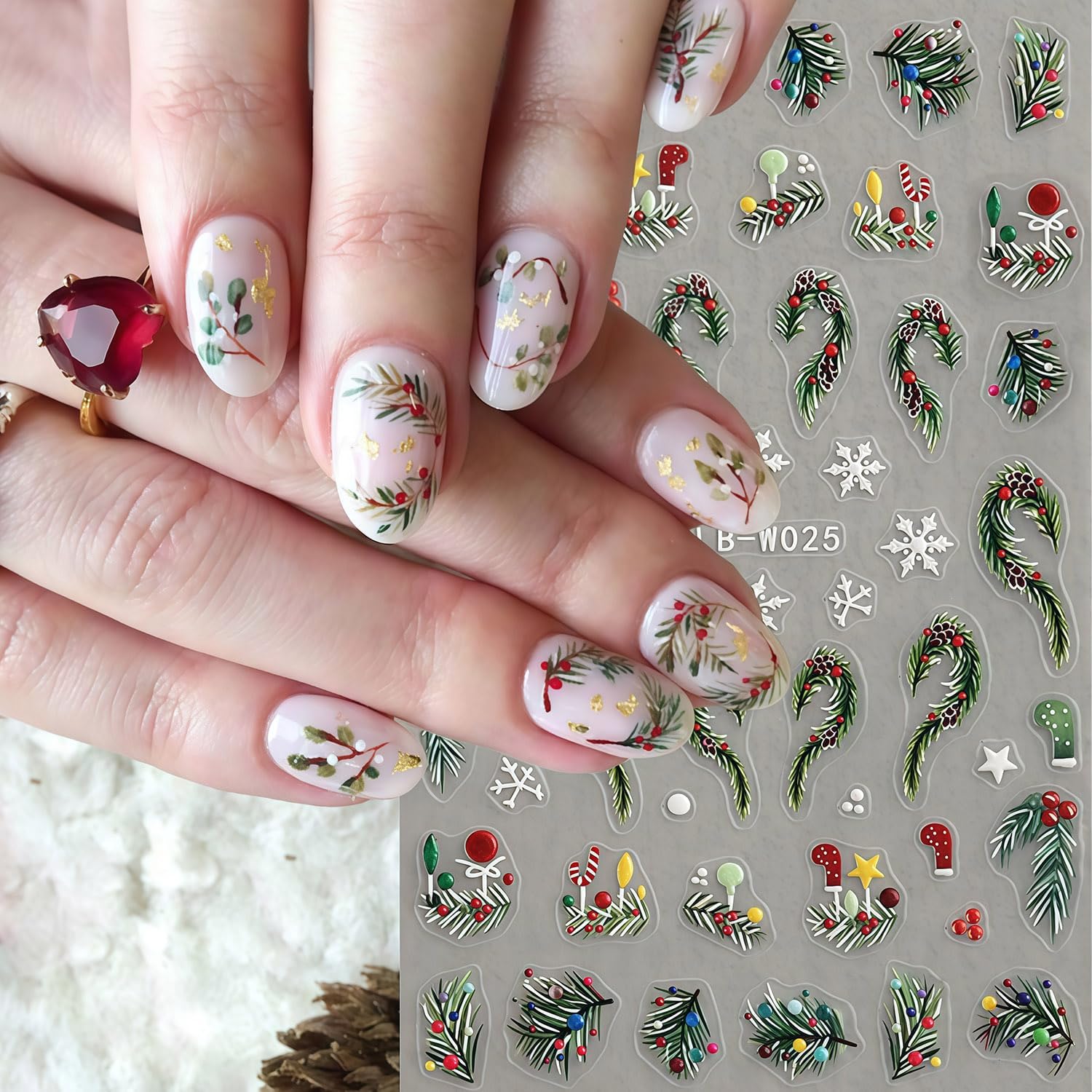 Christmas Nail Stickers 4 Sheets Christmas Nail Art Stickers, 5D Embossed Self-Adhesive Winter Leaves Snowflake Christmas Tree Flower Nail Decals Pattern Design DIY Holiday Nails Decoration for Women