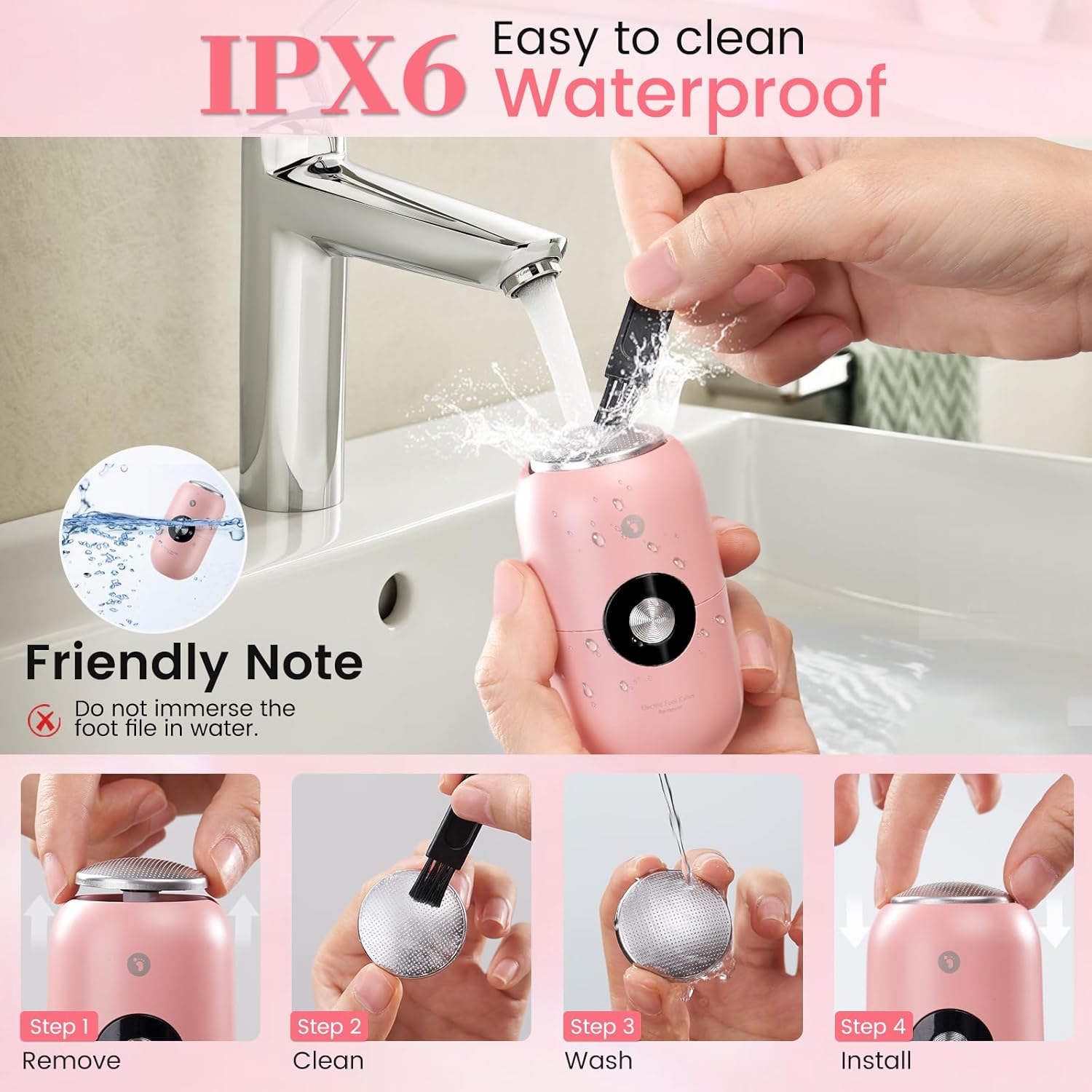 - IPX6 Waterproof Foot File-Wet or Dry Use: The high-speed grinding head removes calluses from dry or wet feet with a light touch—no need for heavy rubbing . After use, simply rinse it under the faucet; debris washes away instantly, eliminating the hassle of manual cleaning. Note: Keep it away from the charging port to avoid soaking and extend its lifespan.